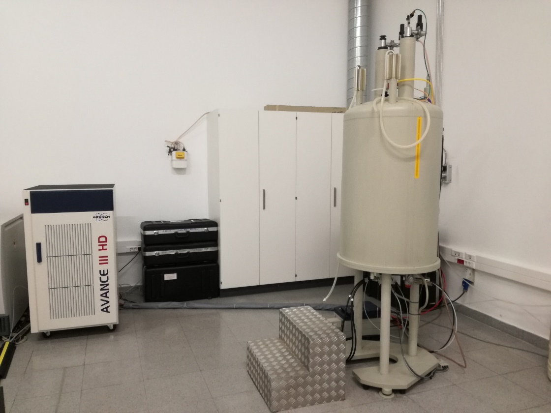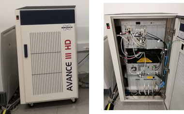 Consola Avance-III: Equipada con 2 canles de radiofrecuencia e deuterio. Gradiente PFG en eixe Z. Xeradores de forma de onda para pulsos selectivos. Control de temperatura VT.