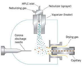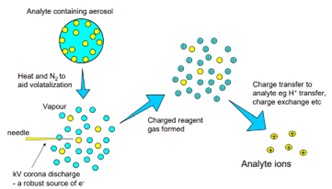 Coma en ESI, créanse pequenas gotas do solvente coa fase móbil e o analito, que entran nun vaporizador. O vaporizador é un tubo cerámico illado, que ó quentarse, evapora as gotas de aerosol da fase móbil por radiación térmica. A temperatura do vaporizador é de arredor duns 350ºC, pero pódese axustar a temperatura. O eléctrodo de descarga de coroa (agulla de alto voltaxe) xera electróns nun campo eléctrico forte que ionizan o gas nebulizante (nitróxeno), e estes ións reaccionan coas moléculas de disolvente formando ións reactivos, que á súa vez, reaccionan cas do analito por transferencia de protóns. Esta serie de reaccións químicas en cascada resultan na ionización química suave das moléculas de analito a presión atmosférica e xeralmente a alta temperatura. Dita agulla atópase nunha posición fixa na saída do gas do vaporizador, preto da corrente do gas do analito.