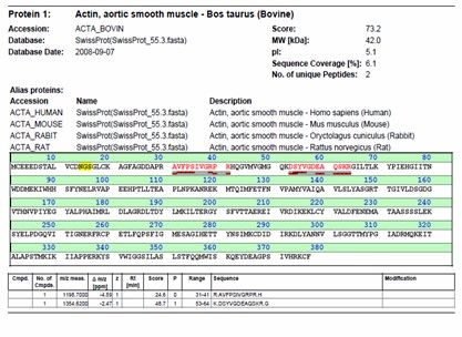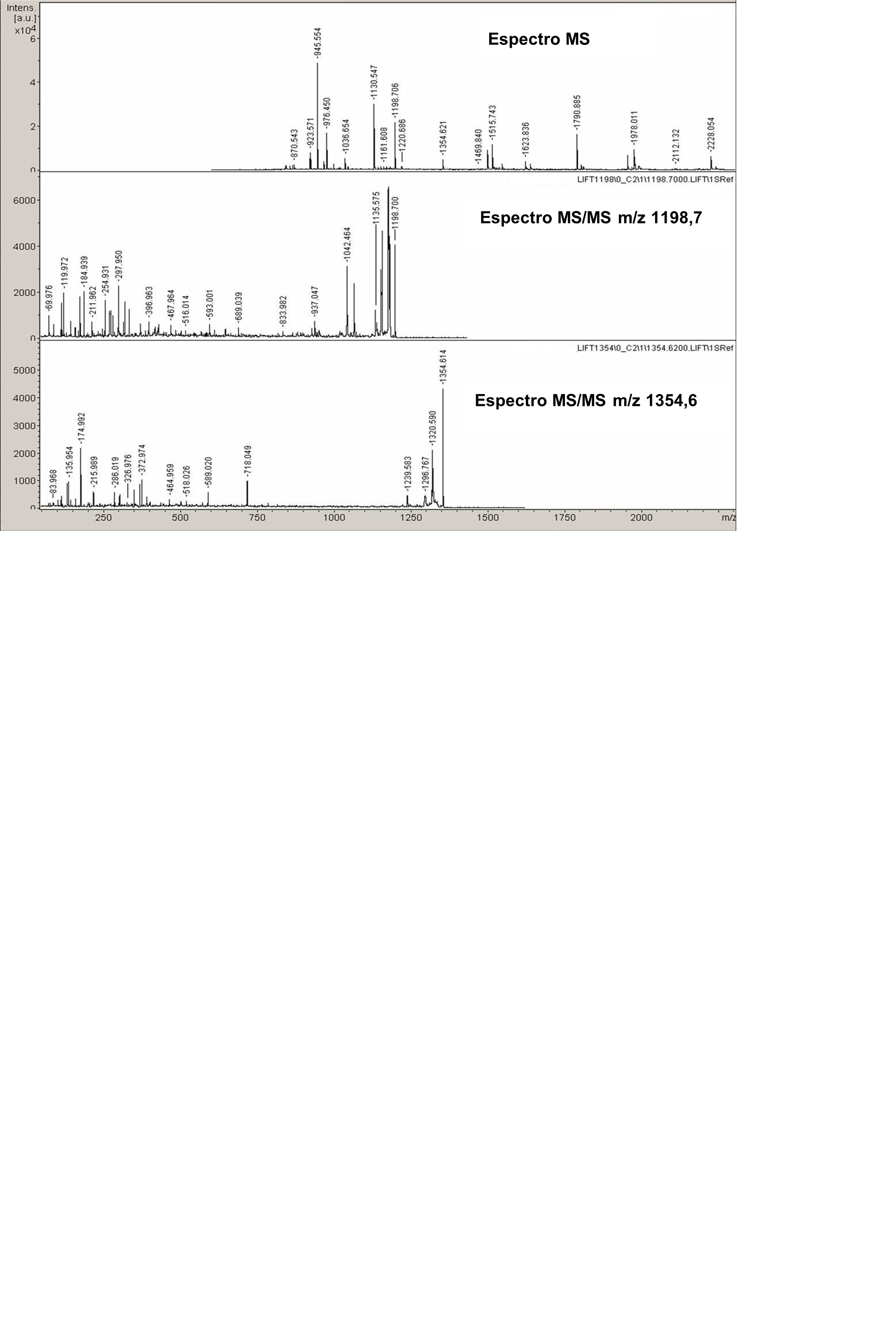 Identificación de proteínas mediante os espectros de fragmentación dalgunhas das masas dos péptidos obtidos, usando o espectrómetro de masas Ultraflex III TOF/TOF (Bruker) e a súa correlación coas bases de datos existentes. A fragmentación dos péptidos pódese facer mediante a fragmentación LID (descomposición metaestable) ou CID “Collision-Induced Dissociation” (fragmentación de alta enerxía).