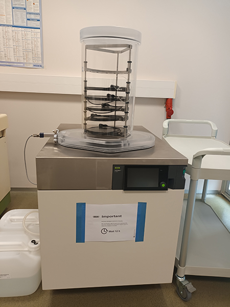 Inclúe varias bandexas aumentando deste xeito a superficie útil de liofilización. Determinación de punto final de secado primario e de secado secundario a través de sondas de temperatura, con control de temperatura da mostra. Alcanza a presión necesaria de liofilización en menos de 15 minutos. O equipo dispón de sistema de desconxelación automático baseado no uso de vapor de forma alterna entre vos condensadores sen necesidade de supervisión non limitando a capacidade de condensación do equipo.