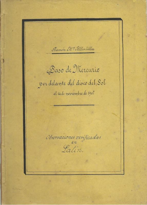 Un texto inédito manuscrito de 40 páxinas de Ramón María Aller atopado recentemente nos fondos bibliográficos do Observatorio Astronómico da USC acaba de ver a luz tras a súa publicación en formato facsimilar no último número de Descubrindo. Anuario de estudios e investigación de Deza. Como explica o director do Observatorio compostelán e prologuista do facsímil, José A. Docobo, “dado o seu interese e calidade, o documento abrangue todos os requisitos para ser considerado unha publicación científica”, o que ademais convertería a este documento “a primeira publicación ao tempo que a última do currículo do sabio lalinense”. O texto agora posto de actualidade é un manuscrito de 40 páxinas titulado ‘ Paso de Mercurio por delante del disco del Sol el 14 de noviembre de 1907. Observaciones verificadas en Lalín’. Docobo destaca que tal como o propio astrónomo e matemático Ramón María Aller fixera constar, a súa primeira publicación científica data de 1912 e correspóndese coas observacións do cometa de Joannesburgo (1910a) as cales están incluídas nun traballo do Anuario do Observatorio de Madrid. Non obstante, constaba a súa participación anterior tanto na observación da eclipse de sol de 1905 como na obtención dos rexistros do tránsito de Mercurio por diante do disco solar en 1907. A existencia destes últimos estaban garantidos por unha carta de contestación de Francisco Iñíguez, daquela director do Observatorio de Madrid, aínda que das observacións en si non se tiñan referencias.