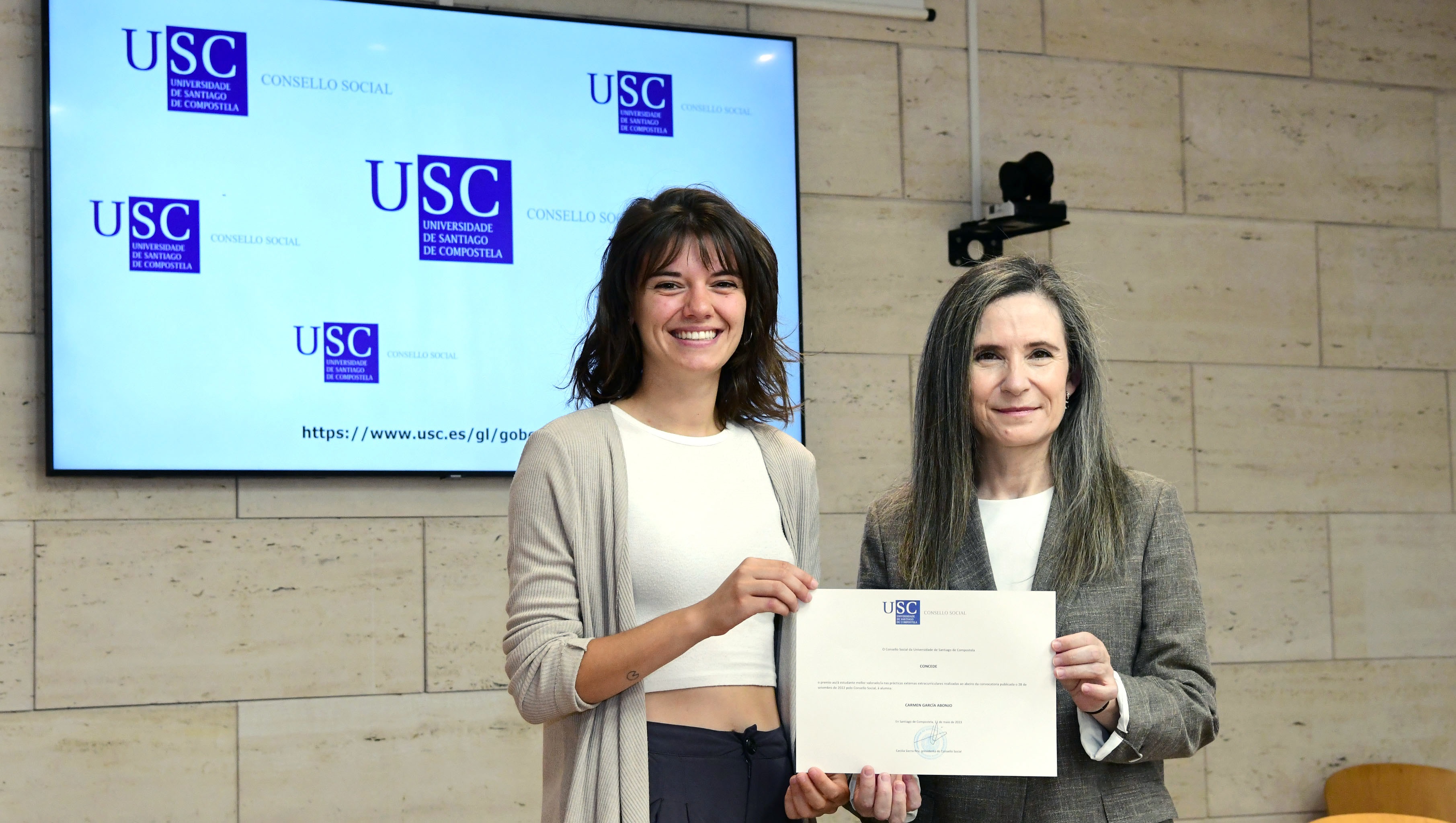 Carmen García Abonjo é a alumna mellor valorada na convocatoria de prácticas do Consello Social correspondente a setembro de 2022. “Estou moi contenta, non o agardaba. Síntome orgullosa e feliz”, afirmou a estudante do grao en Veterinaria que recolleu este venres 16 o diploma que o acredita de mans da presidenta do órgano Colexiado, Cecilia Sierra. García Abonjo que estivo titorizada pola profesora da USC, Maribel Quiroga, e por Ana Belén Cadavila Cortizo, da clínica Taravela, quixo subliñar que a realización destas prácticas permitiulle obter unha “visión de como é o traballo real na clínica, o día a día. Facer prácticas dáche unha visión máis ampla, ves diferentes modos de traballo”.