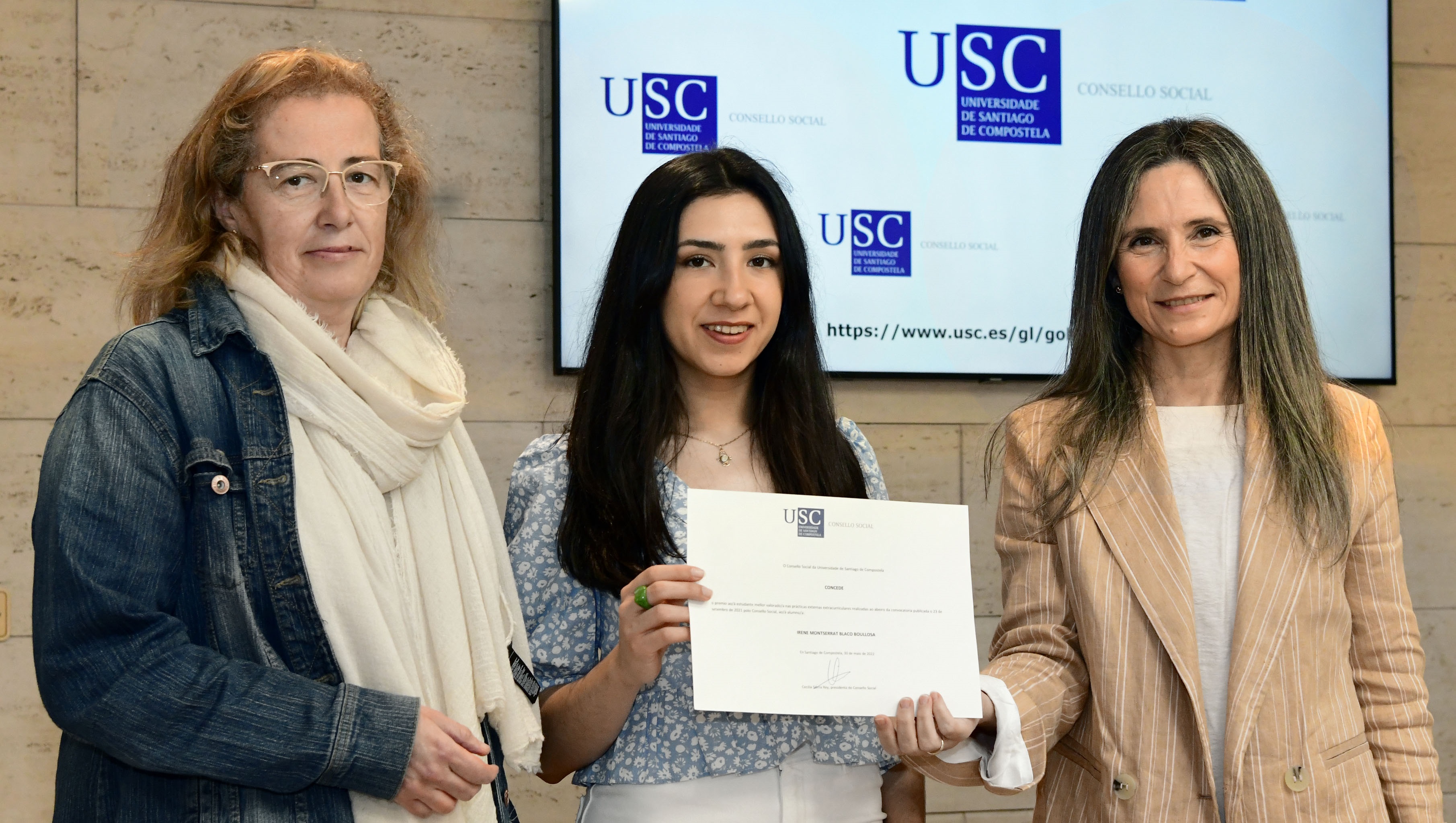 O premio ao alumno/a mellor valorado/a nas prácticas externas extra curriculares que xestiona o Consello Social recaeu este ano na estudante do grao en Historia da Arte, Irene Montserrat Blanco Boullosa, quen realizou prácticas en Artgrafic (Galería Joan Prats) do 11 de novembro de 2021 ao 11 de febreiro de 2022. “Estou moi orgullosa. As prácticas extra curriculares foron para min unha experiencia moi importante porque puiden aplicar algunhas das cuestións que aprendín no grao e conformaron o meu primeiro contacto co mundo profesional”, explicou Blanco Boullosa ao recibir o galardón de mans da presidenta do Consello Social, Cecilia Sierra.