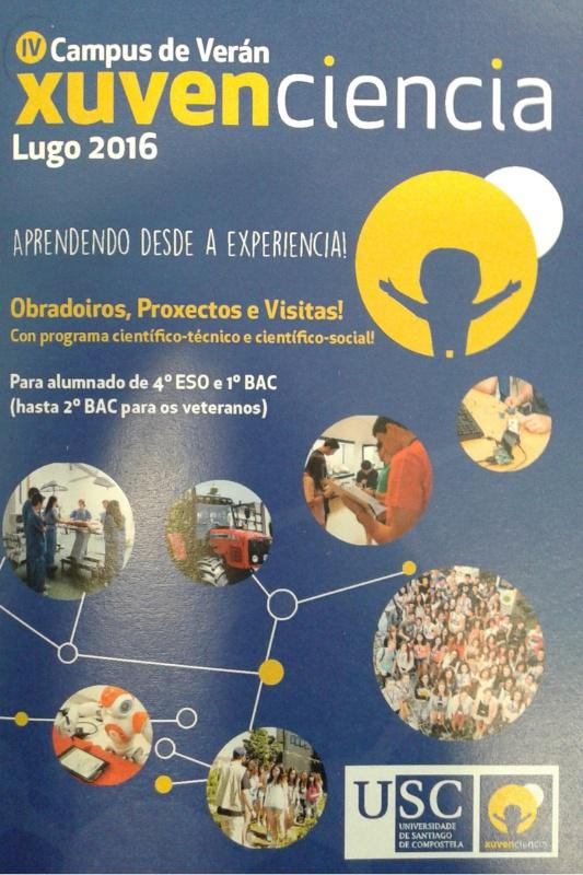 A USC mantén aberto ata o luns 2 de maio o prazo de inscrición na cuarta edición do campus de verán Xuvenciencia, un programa organizado e promovido polo profesorado da sede universitaria luguesa en colaboración coa Vicerreitoría de Coordinación e o programa ‘A Ponte’, que se desenvolverá do 27 de xuño ao 1 de xullo de 2016 e a través do que se pretende achegar a realidade universitaria, así como a oferta de estudos, servizos e as investigacións desenvolvidas no Campus Terra da USC ao estudantado preuniversitario.
