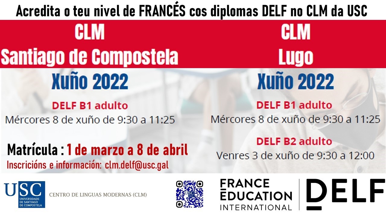 O Centro de Linguas Modernas (CLM) da USC, que participa como centro examinador da convocatoria do ano 2022 da Alliance Française para probas oficiais DELF (Diploma de Estudos en Lingua Francesa), mantén aberta nas súas sedes de Compostela e Lugo ata o 8 de abril o prazo de inscrición para participar nos exames de acreditación do nivel B1, que se desenvolverán o vindeiro 8 de xuño. Asemade, as persoas interesadas en acadar a certificación oficial DELF para o nivel B2 de francés tamén poderán concorrer ás probas de avaliación que se desenvolverán o 3 de xuño na sede luguesa do CLM, localizada na Facultade de Humanidades.