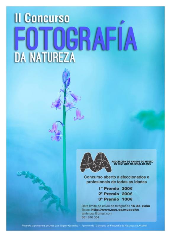 A Asociación de Amigos do Museo de Historia Natural da Universidade de Santiago de Compostela organiza o seu II Concurso de Fotografía da Natureza, aberto a fotógrafos/as afeccionados e profesionais sen límite de idade. As fotografías poderán ser de calquera tema relacionado coa natureza: paisaxes, plantas, animais, rochas, minerais, organismos microscópicos....