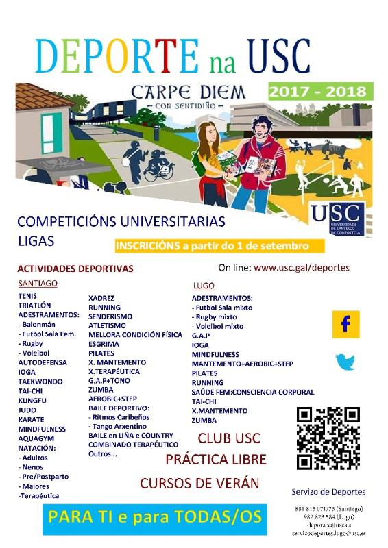 A programación perfilada polo Servizo de Deportes da USC para o curso 2017-2018 dá continuidade as escolas deportivas, ligas e competicións universitarias que se viñan desenvolvendo ao longo dos últimos anos. Trátase dunha oferta ampla e variada que se desenvolverá nos campus de Santiago e de Lugo, aínda que cada sede universitaria presenta un programa deportivo propio.