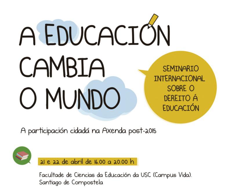 No marco da Campaña Mundial pola Educación, a Universidade de Santiago acollerá os días 21 e 22 de abril o Seminario Internacional polo Dereito á Educación ‘ A educación cambia o mundo. A participación cidadá na Axenda post-2015’ no que participarán axentes educativos galegos pero tamén de Nicaragua e Bolivia. O encontro, gratuíto e para o que é preciso cme-galicia [at] cme-espana.org (inscribirse previamente), desenvolverase na Facultade de Ciencias da Educación (Campus Vida) e nel intervirán o catedrático de Pedagoxía Social da USC José Antonio Caride, o educador nicaraguano especialista en Dereitos Humanos SilVio Gutiérrez e a educadora boliviana Cecilia Lazarte, especialista en xénero, que impartirán distintos relatorios sobre a Educación para Todos e Todas (EPT) ou o cambio de paradigma na nova Axenda post-2015. Ademais, para o día 21 está prevista unha sesión con diversas experiencias da capacidade transformadora da educación en Galicia e unha mesa redonda sobre a educación dende as diversidades. Xa o mércores 22 os relatorios completaranse coa asistencia a uns obradoiros de teatro social, contacontos e radiodifusión e alfabetización mediática. Campaña mundial A Campaña Mundial pola Educación é unha coalición internacional formada por ONG, sindicatos da contorna educativa, centros escolares e movementos sociais que coinciden en reclamar o cumprimento íntegro dos compromisos do Cumio de Dakar (Senegal) de 2000 no que a comunidade internacional se comprometeu a garantir o acceso a unha educación de calidade para todos e todas antes do ano 2015.
