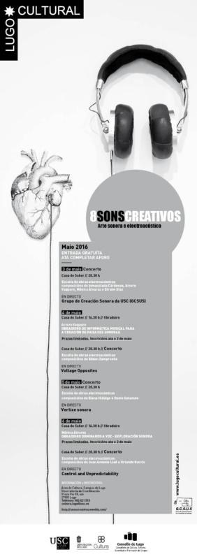 A USC mantén aberto o prazo de matrícula nos obradoiros de informática musical e dominio de voz que se desenvolverán os días 4 e 6 de maio no auditorio da Casa do Saber de Lugo no marco da oitava edición do programa de música experimental e electroacúsica ‘Sons Creativos’.