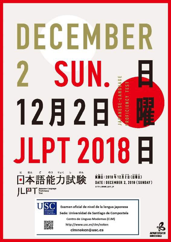 Ao longo do mes de setembro e ata o próximo 2 de outubro é posible formalizar a inscrición no exame oficial de nivel de lingua xaponesa ‘Nihingo Noryoku Shiken’ (máis coñecido en España como Noken) que o Centro de Linguas Modernas da USC (CLM) desenvolverá no mes de decembro na Facultade de Filoloxía. O trámite de inscrición deberá completarse a través da web www.jlpt.es.
