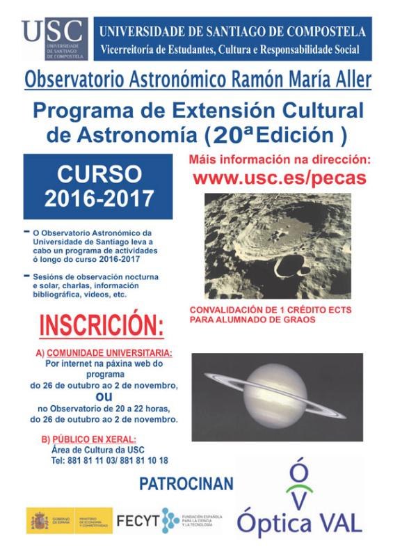 O Programa de Extensión Cultural de Astronomía (PECAS) alcanzará este curso a súa vixésima edición. Dirixido tanto á comunidade universitaria como ao público en xeral, esta é unha iniciativa do Observatorio Astronómico Ramón María Aller da USC (OARMA) que inclúe visitas guiadas ao Observatorio, sesións de observación nocturna tanto a simple vista como con telescopios, observación solar, charlas didácticas e obradoiros.