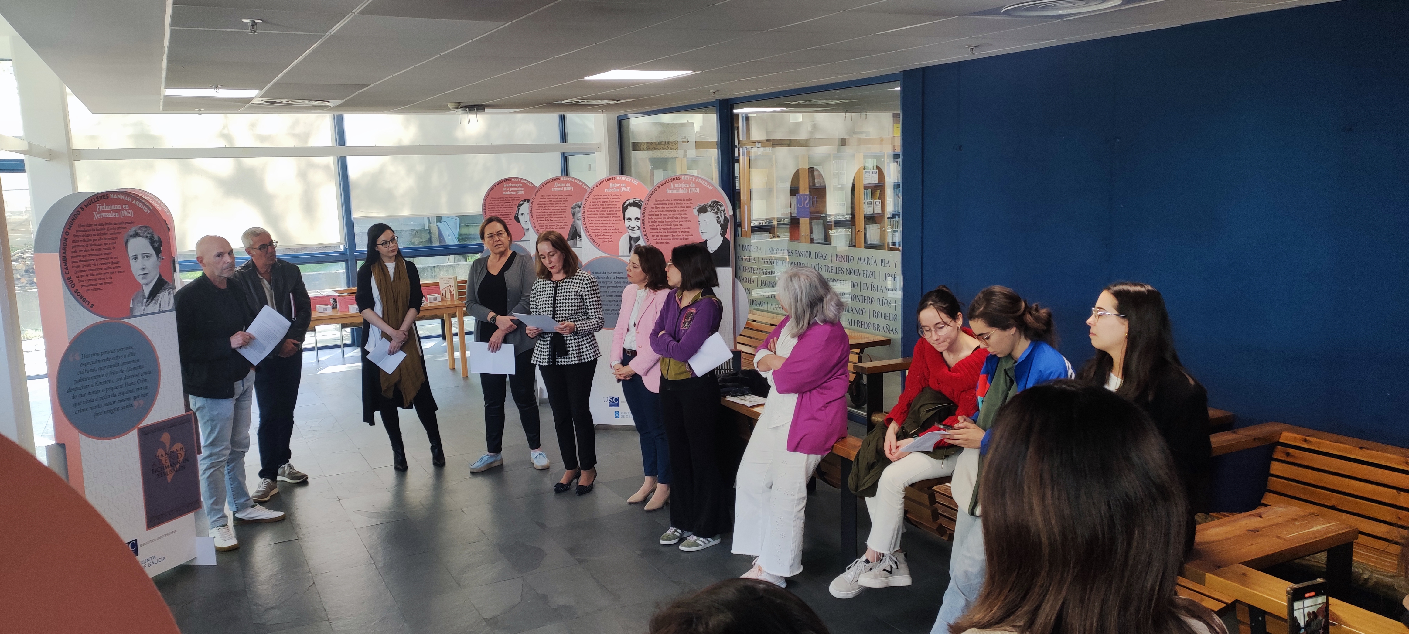 A exposición '8 libros, 8 mulleres que cambiaron o mundo' pode verse desde este martes 23 na Biblioteca Concepción Arenal. Con motivo de conmemorarse o Día do Libro representantes dos equipos decanais de Dereito, Políticas e Relacións Laborais, así como representantes do estudantado desas facultades e persoal da biblioteca leron fragmentos das oito obras arredor das que xira a mostra.