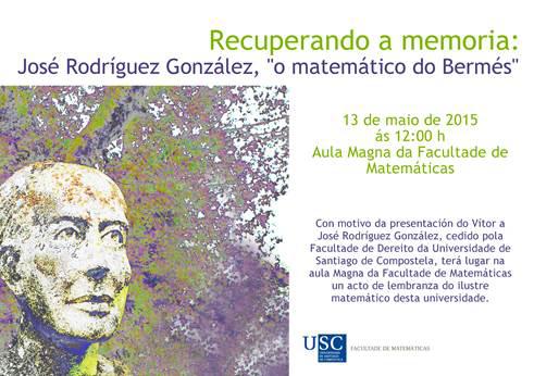 A Aula Magna da Facultade de Matemáticas acolle este mércores 13 un acto en lembranza do ilustre matemático da USC José Rodríguez González (Bermés, Lalín 1770 - Santiago de Compostela, 1824), coñecido como ‘o matemático do Bermés’. O acto, ás 12.00 horas, celébrase con motivo da presentación do vítor a José Rodríguez González que a Facultade de Dereito da USC lle cede á de Matemáticas. Intervirán a decana e o decano de Matemáticas e Dereito, Victoria Otero e Luis Míguez, respectivamente; e o profesor Xosé María Masa Vázquez, que fará unha lembranza do ilustre matemático desta universidade.
