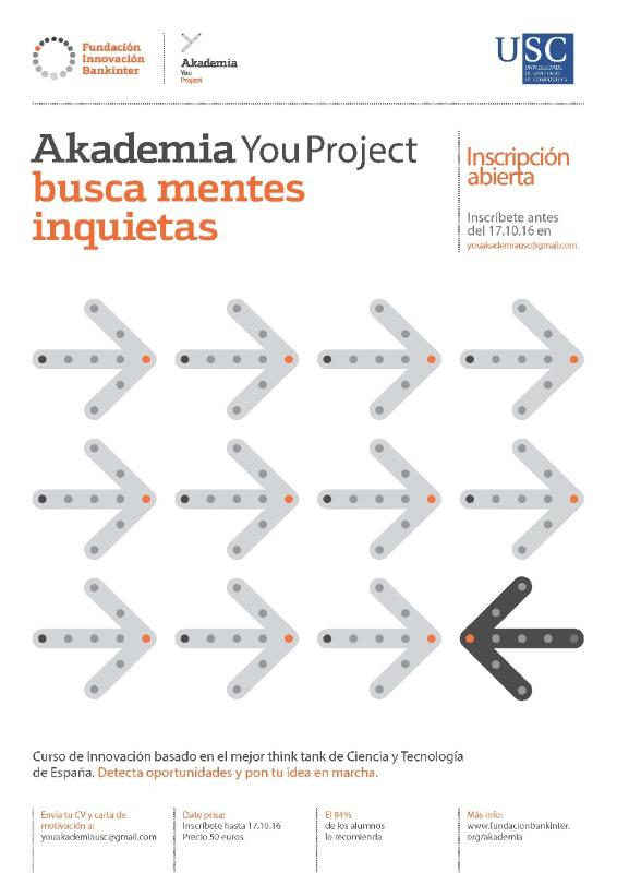 Akademia Project acaba de ampliar o prazo de inscrición ata o próximo luns 17 de outubro, trámite que se poderá formalizar enviando un currículo a a youakademiausc [at] gmail.com (youakademiausc[at]gmail[dot]com). O 94% do alumnado que participou en Akademia Project en anteriores edicións recomendan a realización deste curso que busca estimular a actitude innovadora e espertar o espírito emprendedor entre estudantes das principais universidades españolas. Impulsado pola USC e a Fundación Bankinter, as persoas que o cursen terán a oportunidade de vivir o proceso completo de innovación, desenvolvendo un proxecto emprendedor coa axuda de emprendedores e business angels.