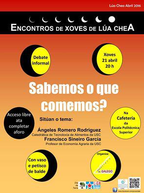 Os Encontros de Xoves de Lúa Chea, un programa de debate sobre cuestións de actualidade organizado polo colectivo universitario Proxéctate en Galego celebra este xoves 21 de abril un novo coloquio na cafetería da Escola Politécnica Superior do Campus de Lugo, onde, baixo o título ‘ Sabemos o que comemos?’, se abrirá un debate aberto sobre os alimentos e as dietas que seguimos.