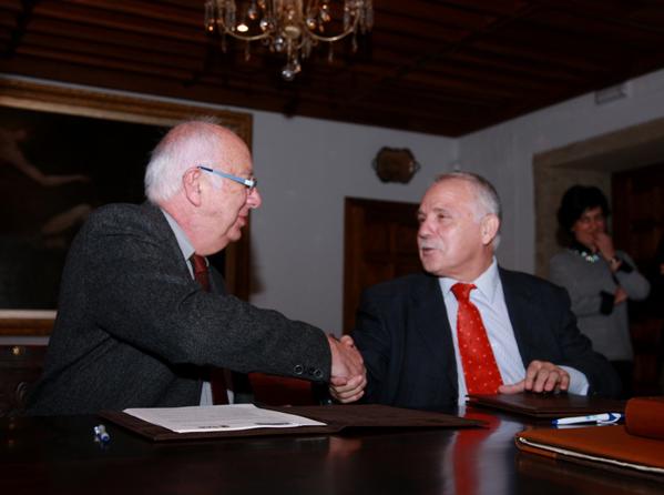 Juan Casares e Javier Jiménez Calavia asinaron o encontro no despacho reitoral. Foto: Servimav-USC