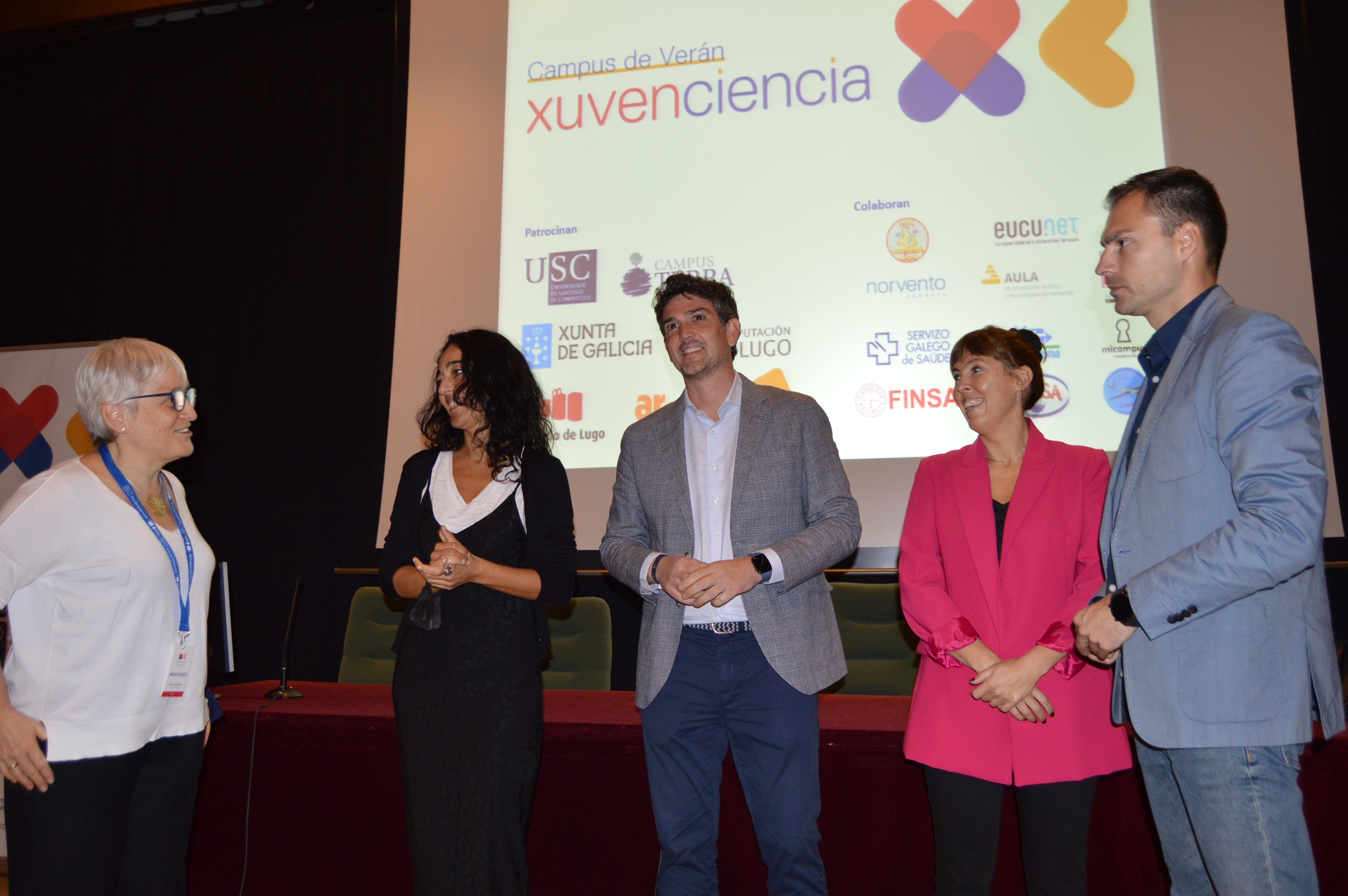 O noso obxectivo é facilitar que a mocidade participante teña a oportunidade de mergullarse nalgunhas das liñas de investigación máis punteiras que están a desenvolver na actualidade no Campus de Lugo, salientou a coordinadora do grupo de innovación docente da USC XuvenCiencia, Mercedes Novo, na sesión inaugural deste campus estival celebrada no auditorio da Facultade de Veterinaria. A concelleira de Benestar Social, Igualdade e Inclusión do Concello de Lugo, Ana González Abelleira ; o deputado provincial delegado da área de Promoción Económica e Social, Pablo Rivera Capón; o delegado da Xunta en Lugo, Javier Arias, e a adxunta á presidencia do Grupo Aresa, Carlota López, tamén participaron na apertura institucional deste campamento científico de verán no Campus de Lugo.