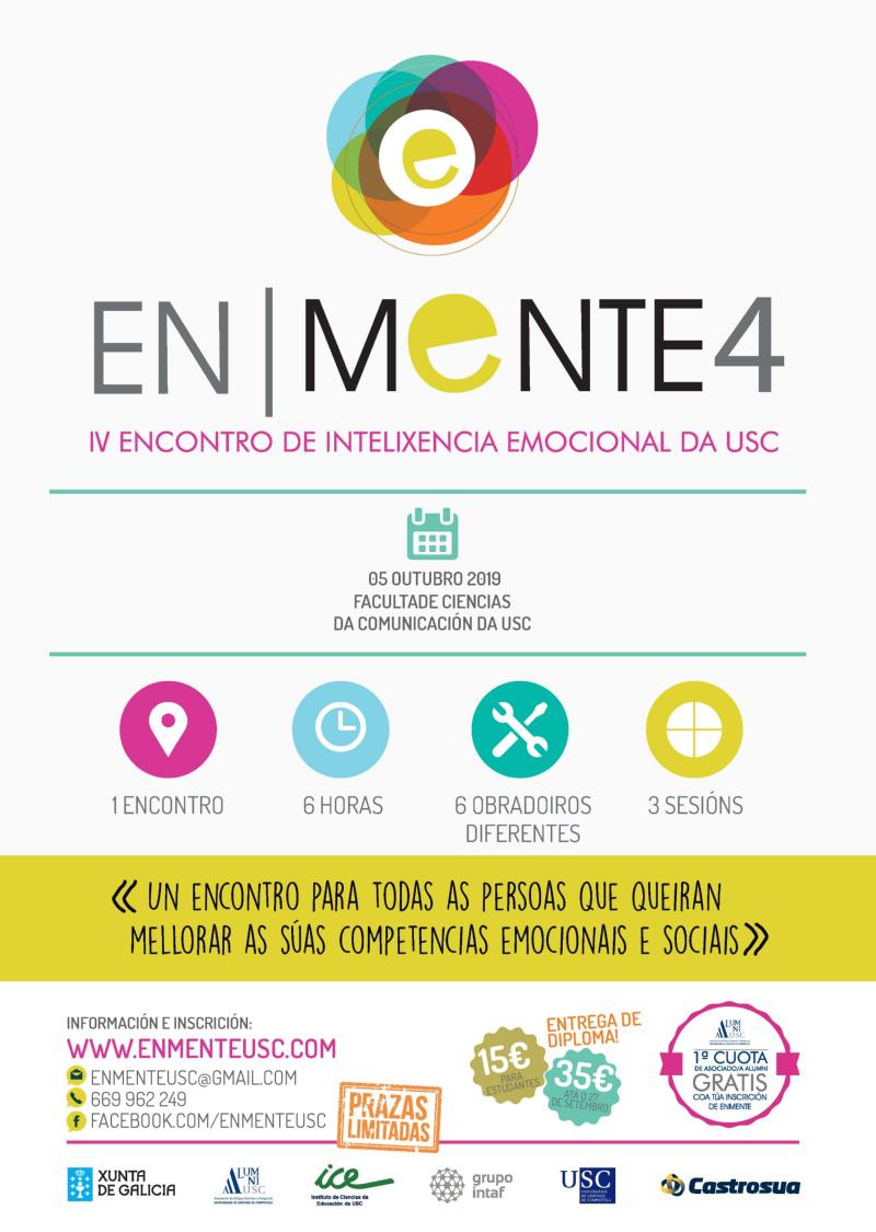 A Asociación de Antigos Alumnos e Amigos Alumni USC organiza xunto co Instituto de Ciencias da Educación o IV Encontro de Intelixencia Emocional Enmente 4 que terá lugar o vindeiro 5 de outubro na Facultade de Ciencias da Comunicación. O primeiro prazo de inscrición con taxas reducidas permanecerá aberto ata o vindeiro 27 de setembro e pode formalizarse premendo nesta ligazón.