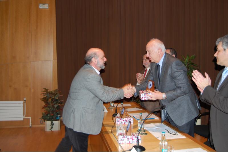 O reitor da USC, Juan Casares, presidiu en Lugo o cambio de nome da antiga Escola de Maxisterio, que desde decembro de 2011 pasou a denominarse oficialmente Facultade de Formación do Profesorado tras a súa adaptación ao Espazo Europeo de Educación Superior. Casares destacou o feito de que este centro “sexa o primeiro en celebrar oficialmente o seu cambio de denominación, o que dá proba da súa sensibilidade e da capacidade para facer as cousas doutro xeito que dan tantos anos de experiencia e traxectoria”. “Como escola, e agora como facultade, este centro deu moito á nosa universidade, e estamos seguros de que así seguirá sendo no futuro”, concluíu o reitor da USC. Baixo o título ‘De Escola Normal de Mestres a Facultade de Formación do Profesorado. 1842-2011’, o acto académico serviu tamén para facer un percorrido pola historia deste centro que, desde a súa creación hai 170 anos, foi obxecto de sucesivos cambios de localización e nome ata a súa recente conversión en Facultade. Francisco Rodríguez Lestegás, actual decano o centro, foi o encargado de rememorar os momentos e as persoas máis relevantes deste longo período. No acto interveu tamén o presidente do Consello Social da USC, Manuel Puga Pereira. Para Puga, “a equiparación deste centro co resto de facultades é un xesto de dignificación para esta profesión e para a institución en xeral, xa que é aquí onde unha das razóns de ser da universidade, a transmisión de coñecementos, se concreta máis claramente”. Homenaxe aos últimos directores Como parte do acto, o director do centro entre 1967 e 1979, Joaquín Marbán Román, deu lectura ao relatorio ‘Sobre la comunicación’. Na súa intervención, Marbán falou da importancia da comunicación acción formativa, e aclarou as diferenzas entre instrución e educación e entre saber e coñecer. Con motivo desta transformación en Facultade, levouse a cabo un acto de homenaxe ás seis persoas que estiveron á fronte da institución nos últimos 45 anos. Ademais do propio Joaquín Marbán Román, recoñeceuse o labor de Dolores Suárez Fernández, José Manuel Vez Jeremías, José Antonio García Gandoy, Eugenio Otero Urtaza e Modesto Rodríguez Neira. O reitor da USC, Juan Casares, entrega un agasallo a un dos ex directores do centro homenaxeados no acto