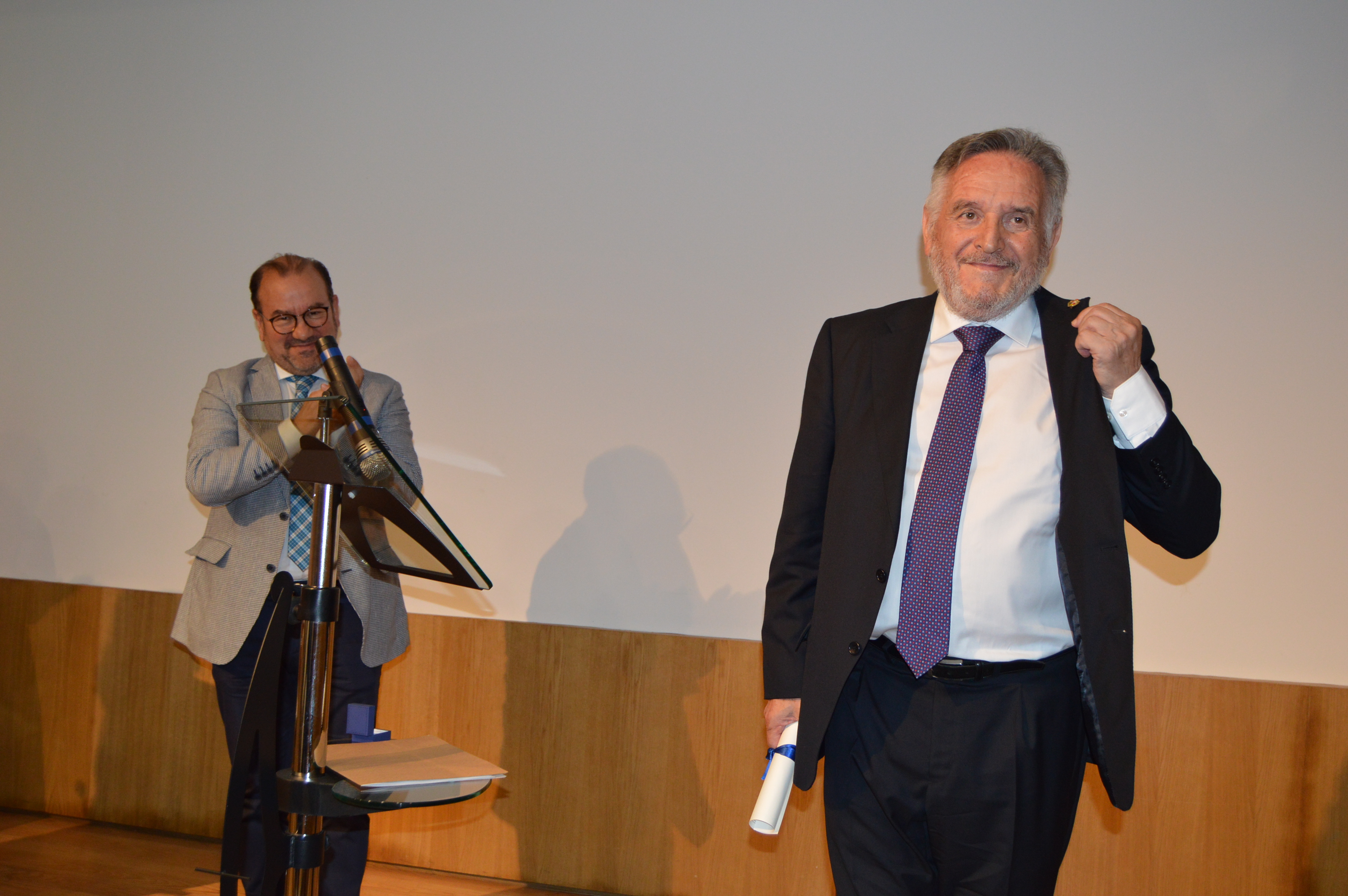 Antonio Rigueiro amosa a Insignia de Ouro da USC en presenza do reitor Antonio López