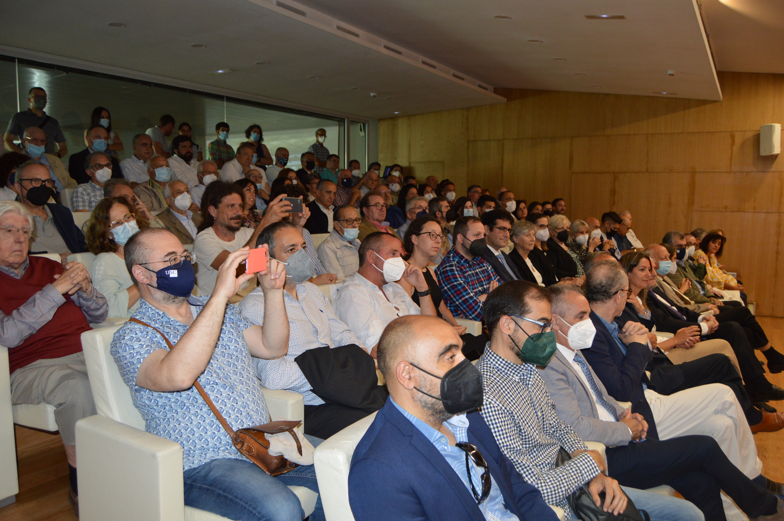 O acto de entrega da Insignia de Ouro da USC a Antonio Rigueiro congregou na Casa do Saber de Lugo máis dun centenar de persoas, entre as que cómpre salientar a presenza dunha ampla representación de docentes e investigadores universitarios, decanos, decanas e directores de centros universitarios, así como a secretaria Xeral da USC, Dulce García Mella, e o vicerreitor de Organización Académica e Campus de Lugo, Francisco Fraga, ademais de dirixentes políticos, entre os que figuraba a alcaldesa do Concello de Lugo, Lara Méndez, quen reiterou a súa “gratitude” ao profesor Rigueiro.