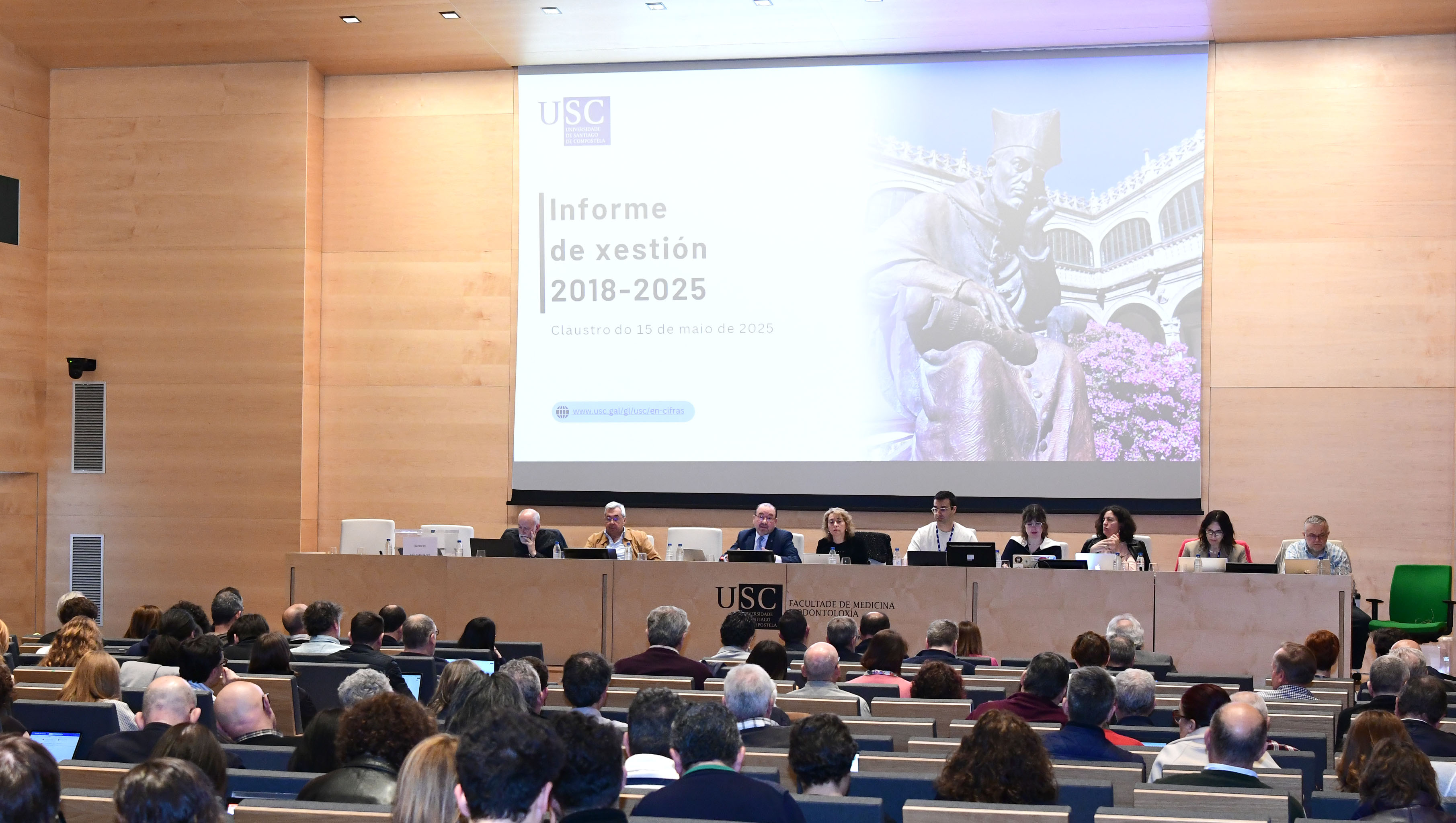 A aposta polas persoas, o investimento en infraestruturas e a redución da débeda centraron os eixos temáticos do Informe do Reitor 24/25 no Claustro
