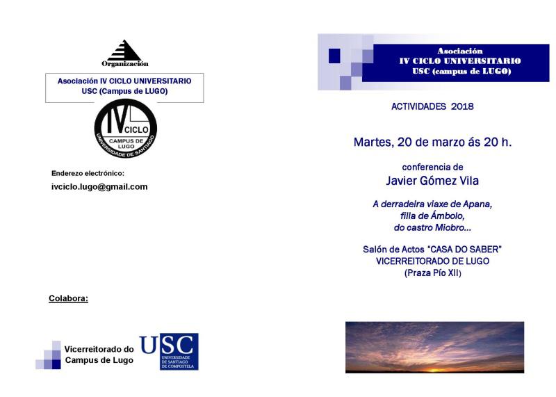 O doutor en Arqueoloxía e Historia Antiga pola USC e profesor no Ies Virxe dos Ollos Grandes da capital luguesa Javier Gómez Vila ofrecerá este martes, a partir das 20.00 horas, no auditorio da Casa do Saber de Lugo, o relatorio ‘A derradeira viaxe de Apana, filla de Ámbolo, do castro Miobro’. A entrada é libre e de balde para todo o público interesado.