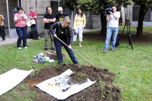 Ao remate enterrou as obras nos xardíns do claustro, onde permanecerán aproximadamente durante seis meses. “Pretendo que a enerxía da natureza interveña no traballo e o modifique como a ela máis lle conveña”, afirmou, ao tempo que compartía a “grande emoción” que sinte cando desenterra as obras. “Ás veces, polo efecto da propia natureza, nunca aparecen”, comentou.