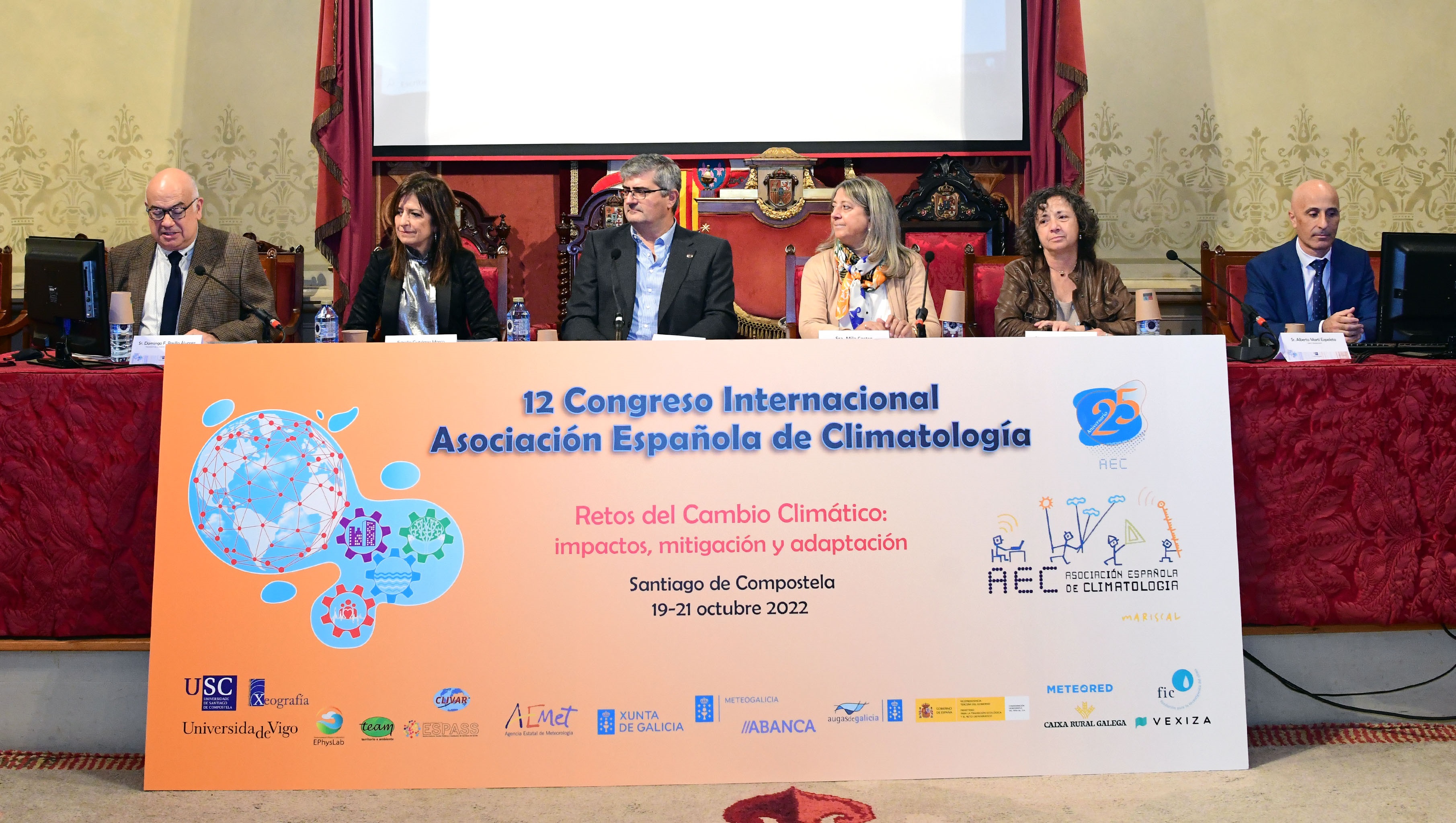 O vicerreitor de Política Científica da USC, Vicente Pérez Muñuzuri, presidiu o acto inaugural no que tamén interviñeron Mila Castro, concelleira en materia de Medio Ambiente do Concello de Santiago; Estrella Gutiérrez Marco, en representación da Axencia Estatal de Meteoroloxía (AEMET); a directora xeral de Calidade Ambiental, Sostibilidade e Cambio Climático da Xunta de Galicia, María Sagrario Pérez Castellanos; Domingo F. Rasilla, presidente da AEC; e Alberto Martí Ezpeleta, integrante do comité organizador.