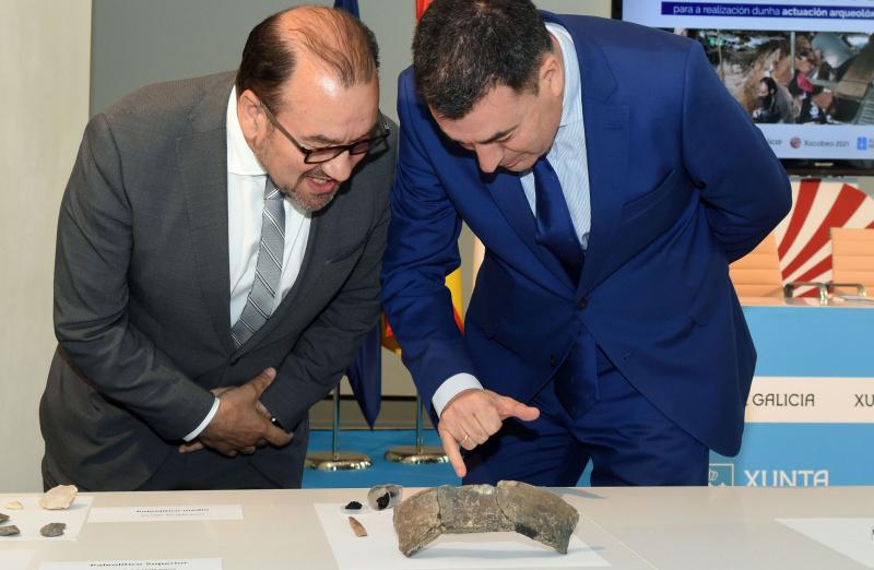 Na sinatura do convenio, de dereita a esquerda, Ramón Fábregas, Antonio López, Román Rodríguez e María del Carmen Martínez Ínsua. Foto: Santi Alvite O reitor e o conselleiro observando o último achado. Foto: Santi Alvite