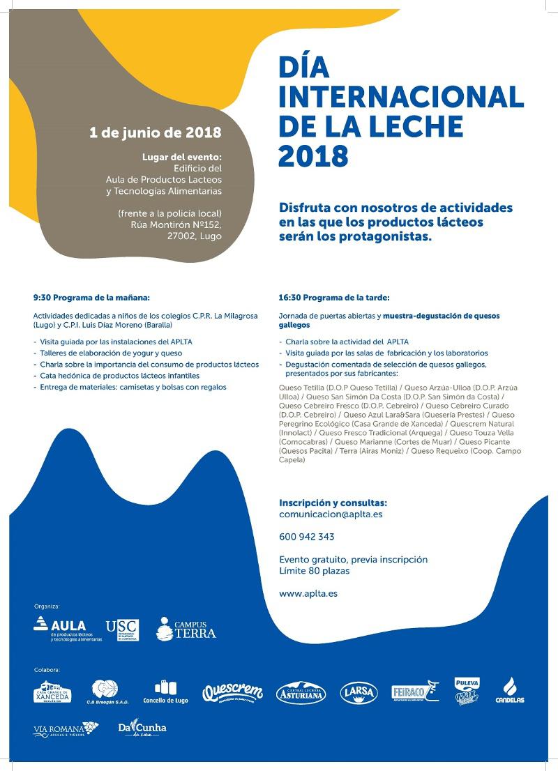 A Aula de Produtos Lácteos e Tecnoloxías Alimentarias (Aplta) do Campus Terra da USC organizará este venres unha xornada de portas abertas e unha degustación de queixos galegos co gallo da celebración do Día Internacional do Leite 2018, unha efeméride que se celebrará o 1 de xuño.