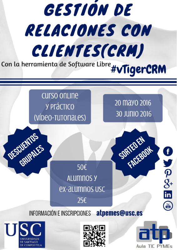 Este obradoiro virtual, cuxos contidos están baseados na última versión actualizada e dispoñible da ferramenta de software libre vTigerCRM, ten unha marcada orientación práctica, inclúe vídeos de titores en liña e está orientado á participación de autónomos e pemes, ademais de calquera outra persoa interesada nesta temática. Estruturado en 50 horas de formación, o prazo de inscrición no IX ObradoiroVirtual sobre Xestión de Relacións con Clientes (CRM) permanece aberto na web www.usc.es/atpemes.