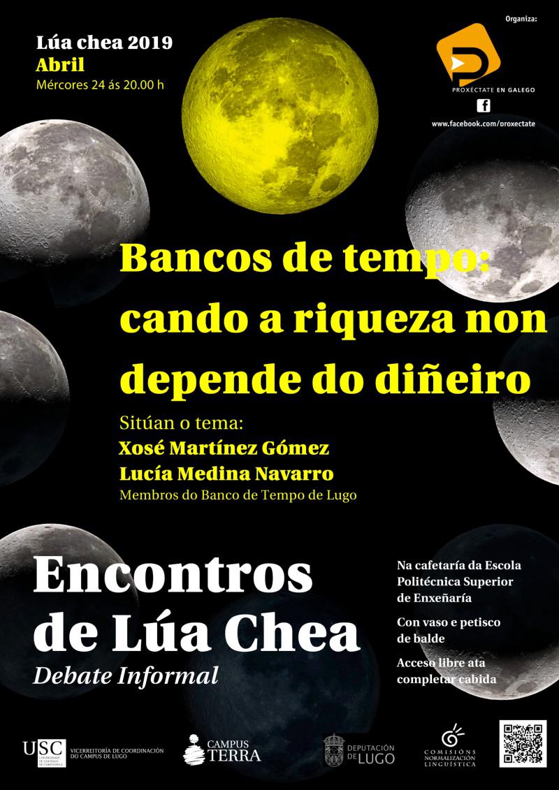 Os Encontros de Lúa Chea, un programa de debate sobre cuestións de actualidade organizado polo colectivo universitario Proxéctate en Galego, celebrará este mércores de 24 de abril, a partir das 20.00 horas, na cafetería da Escola Politécnica Superior de Enxeñaría do campus de Lugo, una nova sesión deste ciclo de debates informais que leva por título ‘Bancos de tempo: cando a riqueza non depende do diñeiro’. A entrada é libre e de balde para todo o público interesado.