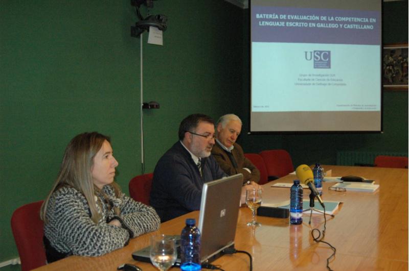 ‘Batería de avaliación da competencia na linguaxe escrita en galego e castelán’ é o nome do proxecto impulsado polo grupo de investigación Optimización das Linguaxe Múltiples da USC, que este mércores presentou as ferramentas para avaliar e detectar as competencias lingüísticas dos escolares de Educación Primaria. Trátase de seis probas, de dous tipos, unhas de cribado de comprensión lectora e composición escrita, e as outras de diagnóstico para o estudo daqueles estudantes que presenten dificultades nas primeiras. O proxecto, presentado na Facultade de Ciencias da Educación nun acto presidido polo decano Lois Ferradás, pretende contribuír á diminución o máis posible do número de alumnos de Educación Primaria que abandonan o primeiro ciclo sen un dominio axeitado á súa idade na linguaxe escrita. De feito, os investigadores responsables do estudo consideran que a falla deste dominio repercute de xeito moi negativo nas aprendizaxes de todas as áreas curriculares e inciden en que é fundamental recuperalo neste período escolar pola dificultade para emendalo con posterioridade. A ‘Batería de avaliación da competencia na linguaxe escrita en galego castelán’, que está subvencionada pola Xunta de Galicia e fondos europeos Feder, pretende completarse coa posta en funcionamento de programas de axuda individuais durante segundo de Educación Primaria para os escolares identificados con dificultades. Así mesmo, proponse que antes do deseño desta axuda individualizada se proceda a realizar unha avaliación diagnóstica máis profunda, na que interveñan varios especialistas, segundo explicou un dos responsables do proxecto, o profesor Andrés Suárez Yáñez. Un númeroso grupo de alumnos e docentes asistiron á presentación do proxecto. Foto Alfonso