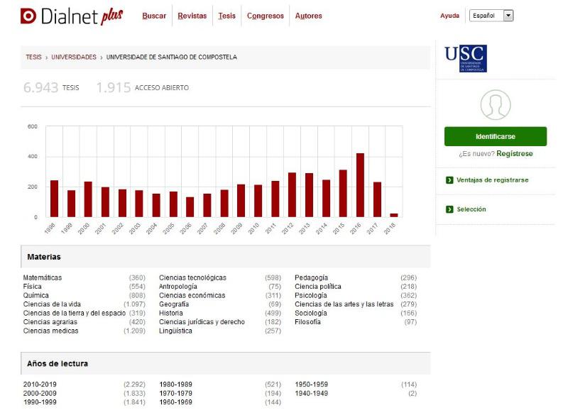 Neste enlace é posible acceder ao buscador Institucional coa pestana de teses activa para a USC. Na marxe esquerda hai distintos tipo de filtro, por texto completo, materias Dialnet, anos e outros. O portal conta igualmente cunha nova páxina de teses que ademais de mostrar un novo buscador dispón de dúas entradas principais: unha por materias da clasificación Unesco e outra por Universidades. A icona de universidades conduce a un mapa coas teses achegadas por cada Universidade distribuídas xeograficamente e ao pinchar en cada institución mostra diferentes gráficos que dan unha visión do reparto por áreas e anos.