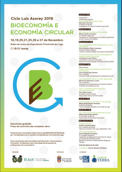 Bioeconomía e economía circular centran a temática dos relatorios e sesións de debate programadas no marco do ciclo Luis Asorey 2019, un foro de divulgación científica promovido pola Real Academia de Ciencias de Galicia en colaboración coa USC que se desenvolverá do 18 ao 27 de novembro no salón de actos da Deputación Provincial de Lugo.