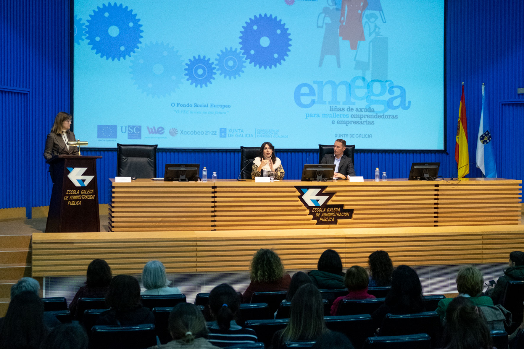 A conselleira da Promoción do Emprego e a Igualdade da Xunta de Galicia, María Jesús Lorenzana Somoza, incidiu nas boas cifras que o emprendemento feminino está a ter na comunidade autónoma e remarcou o esforzo por “crear este espazo de unión entre todas as participantes beneficiarias do programa Emega, un espazo no que exista traslado de coñecementos, das problemáticas enfrontadas e de formación”. Lorenzana lembrou ás asistentes que serven “de impulso e inspiración a novas xeracións de emprendedoras”, demostrando que “con cabeza, con valentía, e con intelixencia, se pode crear novos proxectos empresariais, vivir deles e crear máis emprego”.