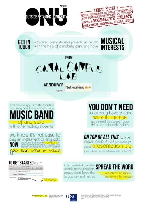 A Área de Cultura acaba de poñer en funcionamento o Laboratorio Aberto de Experimentación, Emprendemento e Creación Visual e Sonora, baixo a dirección do profesor da Facultade de Ciencias da Comunicación Xaime Fandiño. Canal Campus LAB será un espazo de diversificación cultural para a estimulación dentro da Universidade de Santiago da creatividade sonora e visual en todas as súas facetas, así como para potenciar a capacidade de emprendemento cultural da comunidade universitaria e fortalecer a transferencia de coñecemento e innovación coa industria cultural e da comunicación de Galicia. O espazo de referencia deste laboratorio será a Fonoteca Universitaria, lugar de experimentación e posta en valor de iniciativas relacionadas coa creatividade e innovación visual e sonora. A través dunha programación diversificada, Canal Campus LAB adaptará as súas propostas de forma puntual e oportuna ás demandas que non estean contidas de forma específica nos currículos académicos ou que, pola súa actualidade, superen neste ámbito competencial a programación regrada universitaria. Organizaranse cursos e obradoiros específicos nos ámbitos relacionados, así como iniciativas e propostas de carácter lúdico funcional relacionadas con actividades de emprendemento creativo. Deslocalizad@s A primeira iniciativa que impulsará o Laboratorio será ONU, Outside Network University (Deslocalizad@s), un programa dirixido a “potenciar e apoiar o talento, a creación e a interacción musical das persoas deslocalizadas (bolseiros que se atopan na USC procedentes doutros países a través de Erasmus, Séneca, ISEP, ou outros programas de intercambio) e que tocan instrumentos ou cantan e que, estando fóra do seu lugar de orixe, non atopan onde desenvolver as súas aptitudes musicais”, explican os promotores da iniciativa. O obxectivo principal é darlle a oportunidade a este colectivo de conectar con colegas doutros países, que chegaron á USC dentro dun programa de mobilidade, e formar grupos de música de calquera estilo. Neste senso, a Fonoteca proporcionará un lugar para levar a cabo os ensaios. Ademais, se a proposta musical é “novedosa, talentosa e interesante” poderá contar co apoio do equipo CANAL CAMPUS para a difusión e promoción dese traballo.