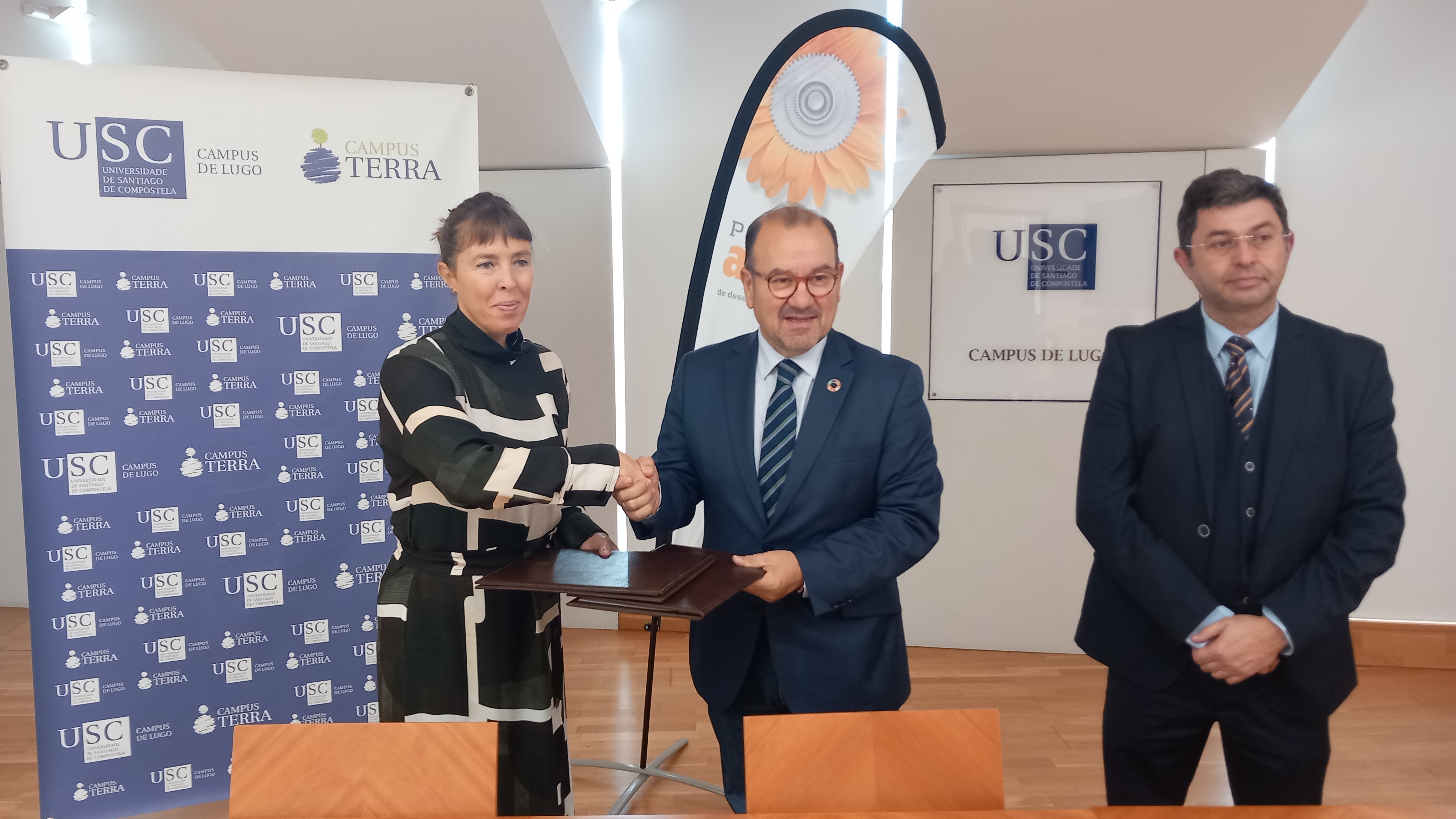 O Premio Aresa leva xa un cuarto de século recoñecendo proxectos que son clave na creación de emprego e riqueza nos ámbitos agrícola e/ou gandeiro “como elementos fundamentais para mellorar a calidade de vida e o benestar das persoas que viven e traballan no medio rural galego”. A sinatura do convenio de colaboración entre USC e Aresa que se desenvolveu este martes 29, no Pazo de Montenegro, marca o punto de partida para unha nova edición deste certame dirixido a empresas, grupos de investigación, asociacións ou calquera outra entidade “que contribúa ao desenvolvemento da economía rural galega”, tal e como destacaron o reitor da USC Antonio López Díaz e a vicepresidenta de Aresa, Carlota López. No acto tamén participou o vicerreitor de Organización Académica e Campus de Lugo, Francisco Fraga, e asistiu a secretaria xeral da USC, Dulce María García Mella.