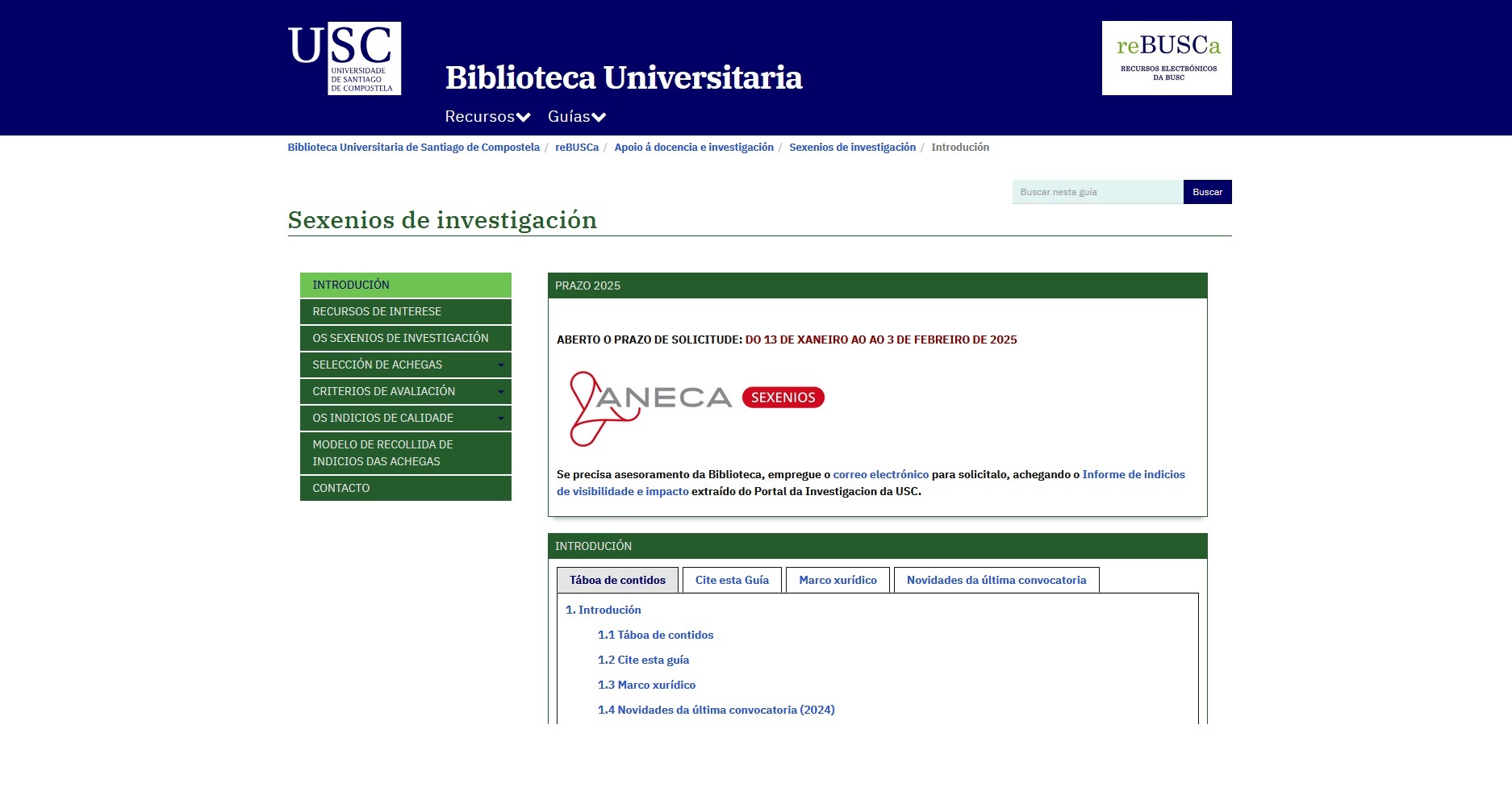 A Biblioteca Universitaria acaba de actualizar a guía sobre Sexenios de investigación, co fin de ofrecer soporte ao Persoal Docente e Investigador da USC na solicitude de avaliación da carreira investigadora, no marco da convocatoria 2024 que se abre o día 13 de xaneiro e remata o 3 de febreiro. Como novidade, a guía incorpora este ano unha ligazón a un vídeo elaborado pola Fundación Dialnet no que se explican os pasos a seguir dende o Portal de Investigación para descargar informes.