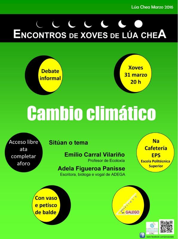 Os 'Encontros de Xoves de Lúa Chea', un programa de debate sobre cuestións de actualidade organizado polo colectivo universitario Proxéctate en galego celebra este xoves 31 de marzo un novo coloquio e debate na cafetería da Escola Politécnica Superior do Campus de Lugo, onde se abordará a cuestión do cambio climático.