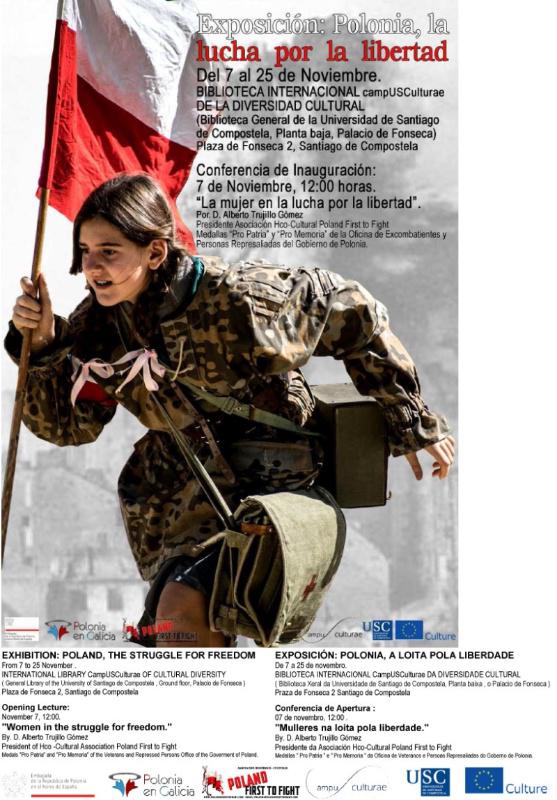 Como primeira actividade, este sábado 7 ás 12.00 horas terá lugar a inauguración da exposición ‘Poland First to Fight, organizada en colaboración coa Asociación Histórico Cultural que leva o mesmo nome, coa Asociación Polonia en Galicia e coa Embaixada en España. Ao acto inaugural asistirán representantes desas entidades así como o vicerreitor de Comunicación, Xosé Pereira. A continuación Alberto Trujillo, presidente de ‘Poland First to Fight’, pronunciará a conferencia ‘ Mulleres na loita pola liberdade’.