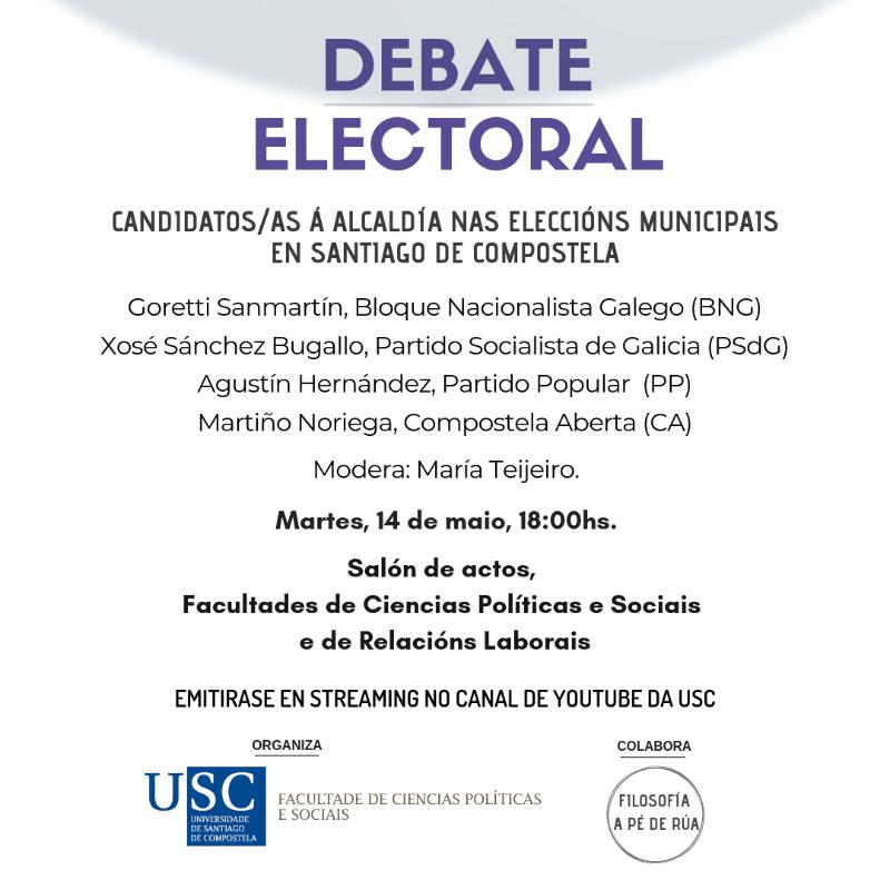 Nese debate, este martes 14 de maio ás 18:00 horas no Salón de Actos do centro, participarán os candidatos e candidata á alcaldía dos partidos con representación actual no consistorio: Martiño Noriega Sánchez (Compostela Aberta), Xosé A. Sánchez Bugallo (PSdeG-PSOE), Agustín Hernández Fernández de Rojas (PPdeG) e Goretti Sanmartín Rei (BNG).