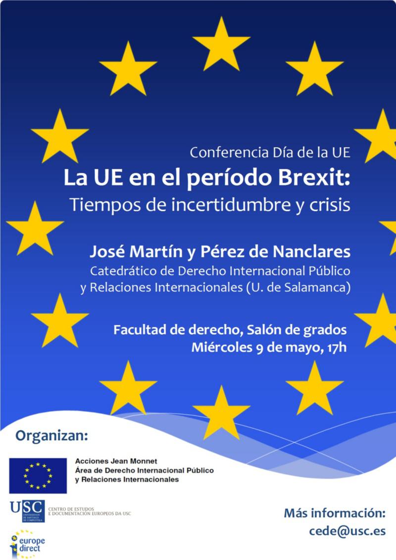 Con ocasión da conmemoración este mércores 9 de maio do Día de Europa, o Centro de Estudos e Documentación Europeos da USC (CEDE) organiza ese mesmo día unha conferencia de José Martín y Pérez de Nanclares sobre cuestións de actualidade. A partir das 17.00 horas no Salón de Graos da Facultade de Dereito, o profesor José Martín pronunciará a conferencia titulada ‘A UE no período Brexit: tempos de incerteza e crise’. O conferenciante é catedrático de Dereito Internacional Público e Relacións Internacionais da Universidade de Salamanca e a entrada será libre sen necesidades de inscrición previa.