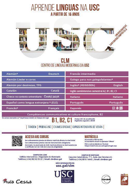 A oferta formativa do CLM aprobada pola Vicerreitoría de Organización Académica da USC para este período é ampla e, alén dos cursos de español e galego, inclúe cursos de alemán, francés, inglés, italiano, portugués, catalán e checo no campus de Santiago. No campus de Lugo, o CLM da USC ofrece cursos de alemán, francés e inglés xunto con galego para non galegofalantes e ELE. A matrícula está aberta para todas as persoas que queiran continuar o estudo da lingua elixida ou comezar a aprendizaxe dunha nova, segundo a normativa recollida na convocatoria e publicada na web do CLM da USC.