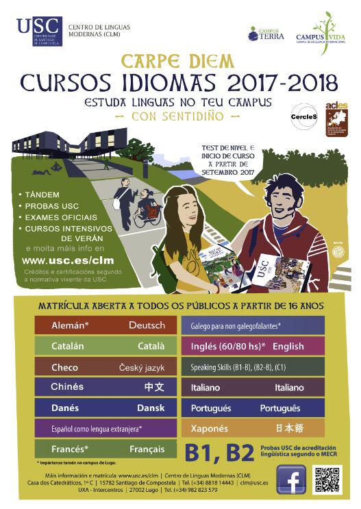 O Centro de Linguas Modernas (CLM) da USC amplía ata o 30 de setembro o prazo para matricularse nos seus cursos de alemán, francés, inglés, italiano, portugués, catalán, checo, chinés, danés, xaponés, galego para non galegofalantes e español como lingua estranxeira.