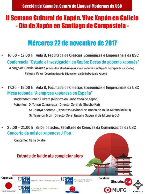 O Día de Xapón en Santiago de Compostela, organizado en colaboración coa Embaixada de Xapón e a Casa Galicia Xapón, comezará ás 16:00 horas na Facultade de Ciencias Económicas e Empresariais coa conferencia ‘Estudo e investigación en Xapón: Becas do goberno xaponés’ a cargo de Gabriel Álvarez, ex erudito Monbukagakusho e tradutor e intérprete de xaponés e español, que estará acompañado da coordinadora de Educación da Embaixada de Xapón, Paloma Valor.