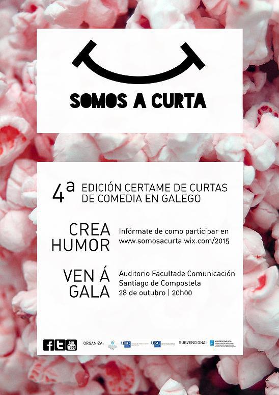 Por cuarto ano consecutivo a Comisión de Normalización Lingüística da Facultade de Ciencias da Comunicación da USC, a proposta da Liga Estudantil Galega, e co apoio do Servizo de Normalización Lingüística da USC, convoca o Premio de pezas audiovisuais curtas de comedia ‘ Somos a curta!’. A inscrición poderase realizar ata o 13 de outubro deste ano. Ao certame pode concorrer calquera membro do alumnado durante o ano 2015 das universidades galegas, das titulacións impartidas nas escolas oficiais de Imaxe e Son ou de bacharelato artístico de calquera dos institutos de educación secundaria de Galicia, que presente unha peza audiovisual breve –cun máximo de 10 minutos– cunha comedia en lingua galega.
