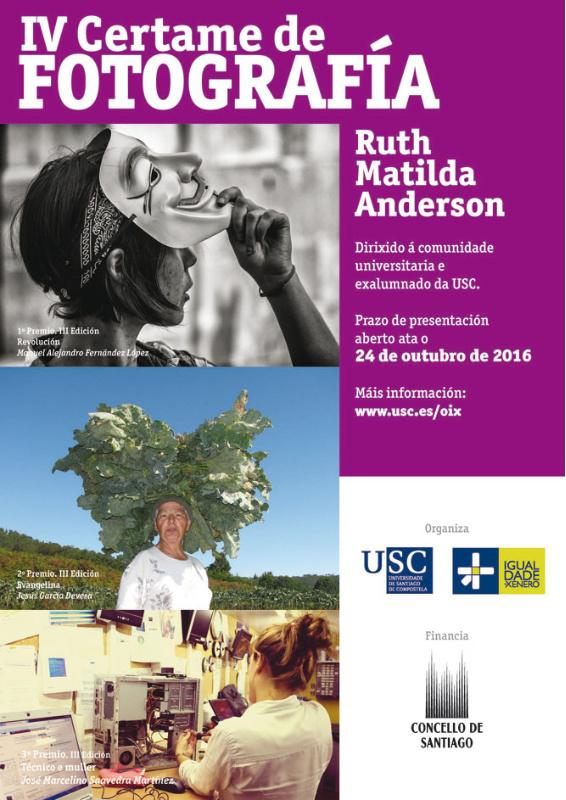 Tanto alumnado como ex alumnado da USC e persoal docente e investigador e de administración e servizos son os destinatarios da cuarta edición do Certame de Fotografía Ruth Matilda Anderson, unha convocatoria promovida pola Universidade de Santiago no marco do convenio de colaboración en materia de igualdade de xénero subscrito co Concello de Santiago.