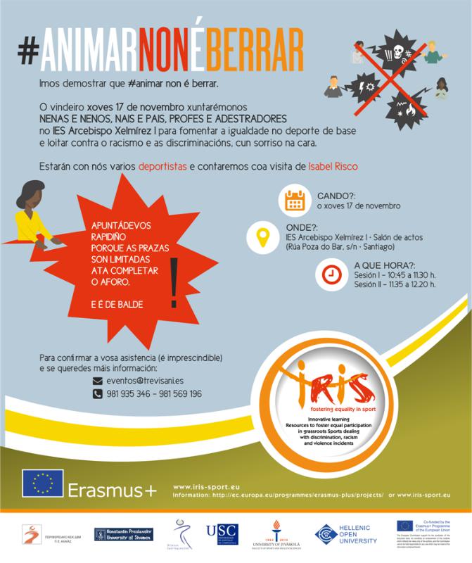A xornada está organizada polo grupo Stellae da USC no marco do proxecto IRIS (Recursos de aprendizaxe innovadores para promover a participación igualitaria en deportes de base, abordando a discriminación, o racismo e incidentes violentos) do programa Erasmus + que busca principalmente a mellora das prácticas deportivas no deporte base para previr a discriminación neste ámbito. De IRIS saíron xa diferentes recursos, como un cómic, un videoxogo, unha curtametraxe infantil e un curso de formación para o profesorado ou adestrador/a que desexe profundar un pouco máis nun ámbito no que aínda falta moito por traballar. En IRIS participan, ademais do grupo Stellae da USC, o Centro Rexional de Formación Profesional e Aprendizaxe Permanente (RCVTLLL) da rexión de Grecia Occidental; a Universidade Konstantin Preslavski de Shumen (Bulgaria); a Universidade de Jyväskylä (Finlandia); a Asociación Deportiva Oltalom (Hungría) e a Hellenic Open University (Grecia).